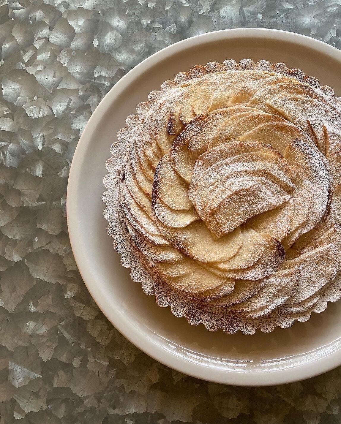 全粒粉入りの香ばしいタルト生地、アーモンドクリーム、紅玉の甘煮、その上にスライスした紅玉、きび砂糖をかけて焼き上げました。